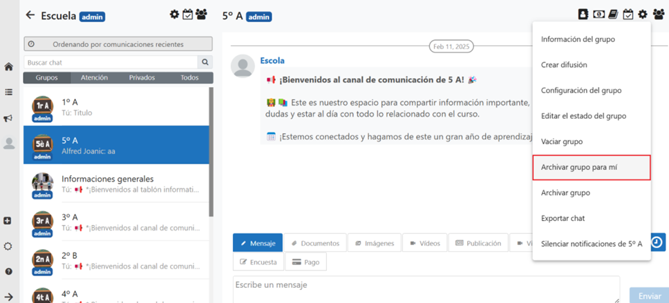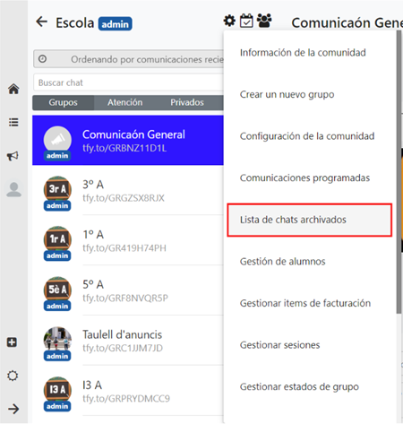 Un administrador de grupo, además, dispone de la opción de archivar un grupo para todos los miembros de la comunidad. La opción también se encuentra dentro de la configuración de grupo , en el botón de Archivar grupo.