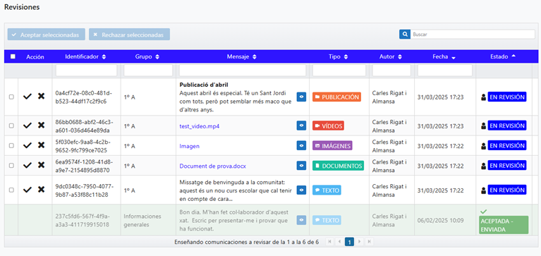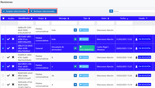 Se pueden aprobar o rechazar las comunicaciones de manera individual con los botones de aceptación o rechazo, a la izquierda de la tabla, pero también se puede hacer con varias comunicaciones de golpe seleccionándolas y pulsando el botón de aceptar seleccionadas o rechazar seleccionadas.