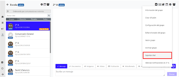 Para exportar la conversación de un grupo debemos de hacer clic en la configuración de grupo y seguidamente a Exportar chat. Posteriormente, se descargará un documento con el historial de todas las comunicaciones que ha habido en el grupo.