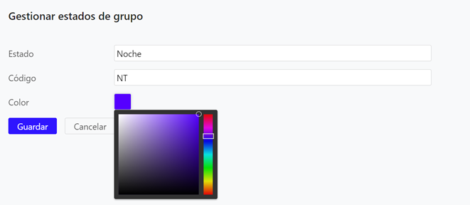 Por consiguiente, para crear un estado de grupo nuevo, se deberá de rellenar los campos con el estado que se desee. Del mismo modo, se deberá de seleccionar un color para el mismo. Por último, se guardará la acción realizada.