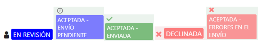 El estado inicial es en revisión, que pasa a aceptada con envío pendiente y a aceptada y enviada. También se puede declinar o encontrar errores durante el envío.