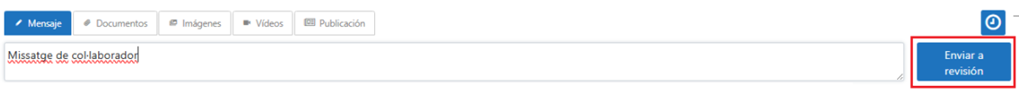 Así, el usuario con permiso de colaborador del grupo, en vez de ver el botón de enviar al lado del mensaje que prepara dentro del grupo (ya sea mensaje de texto, documento, publicación u otro formato), dispone del botón de enviar a revisión.