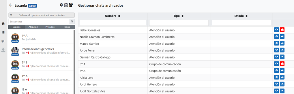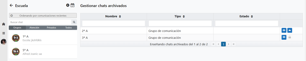 A continuación, se abrirá la siguiente ventana donde aparecerán todos nuestros chats archivados. Se podrán visualizar las comunicaciones mediante el icono de visualización y desarchivar para el usuario que ha iniciado sesión con el icono . El icono permite desarchivar para todos los usuarios, en el caso que se sea administrador del grupo i se ha archivado para todos sus miembros.