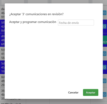 Para completar el envío de una comunicación o rechazarla, un administrador del grupo debe entrar a la pantalla de revisiones desde el menú de comunicación, previsualizar el contenido final de cada mensaje con el botón de visualización, con forma de ojo, y aceptar o rechazar la comunicación.